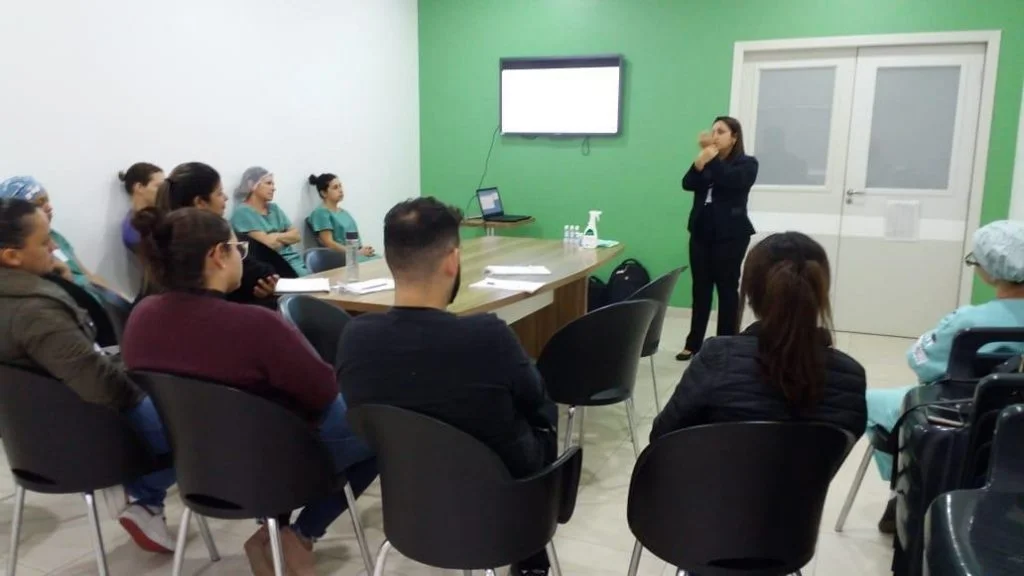 (19/6/2019) Colaboradores do Hospital N. Srª da Graça e da UPA 24 Horas, em São Francisco do Sul (SC), participaram nos dias 13 e 14 de um treinamento sobre limpeza e desinfecção hospitalar, promovido pela empresa Sancapel, especializada no segmento. O treinamento foi ministrado pela enfermeira Gilmara Medeiros, que reforçou as informações sobre o processo de higiene e o uso correto de produtos.