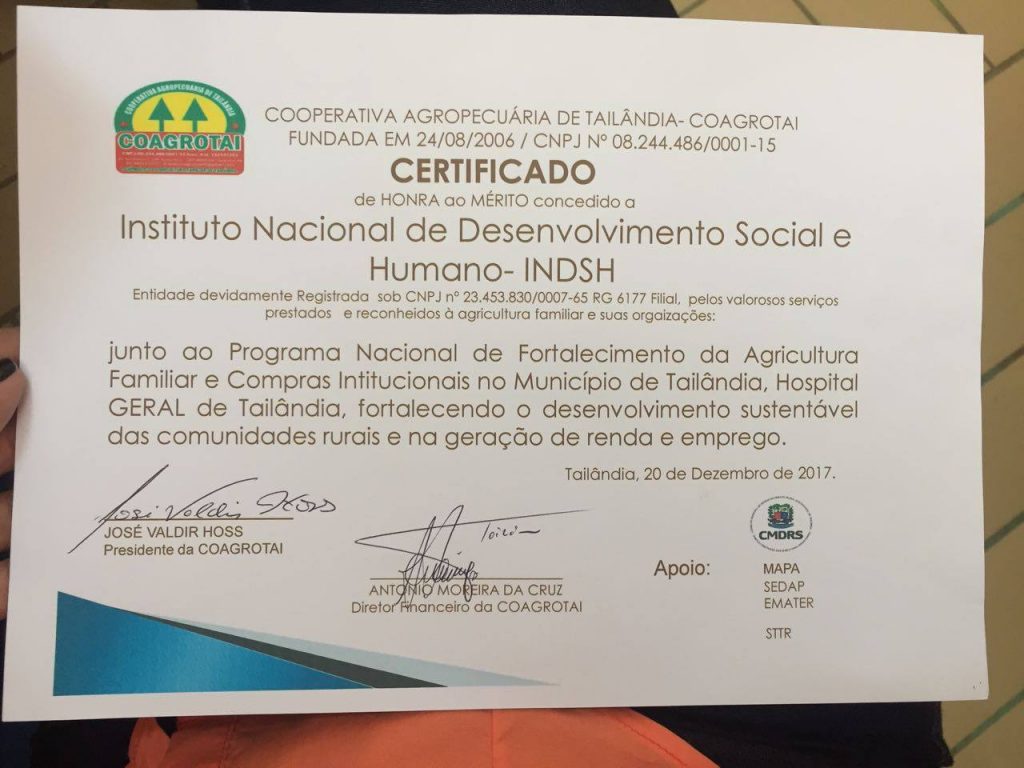 (21/12/2017) O Hospital Geral de Tailândia (PA), administrado pelo INDSH desde 2013, recebeu ontem um certificado de Honra ao Mérito, concedido pela Cooperativa Agropecuária local por fortalecer o “desenvolvimento sustentável das comunidades rurais e (ajudar) na geração de renda e emprego”. O HGT foi representado pela coordenadora do Serviço de Nutrição e Dietética, Aline Fiorese.