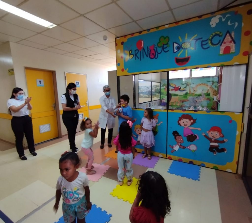 Parte da atividade foi realizada na Brinquedoteca, com atividades de pintura, jogos educativos, brincadeiras no lado externo da unidade (com autorização médica), entrega de brinquedos doados por profissionais da unidade e distribuição de doces (com supervisão nutricional). A ação foi conduzida pelo Grupo de Trabalho de Humanização (GTH).