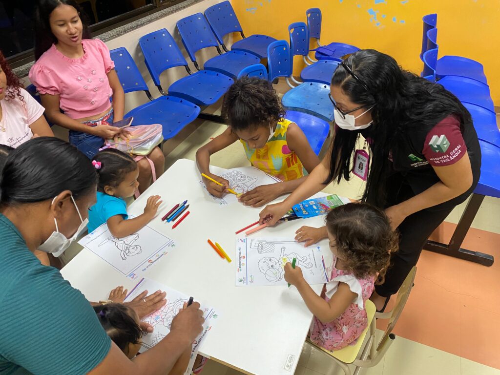 O Hospital Geral de Tailândia (PA) promoveu na última semana de julho uma oficina com o tema Olimpíada para crianças que aguardavam consulta na Pediatria. Sessões de pintura, brincadeiras e ações educativas, abordaram os famosos arcos olímpicos. Objetivo foi reduzir a ansiedade das crianças e mães, enquanto aguardavam pela consulta médica.