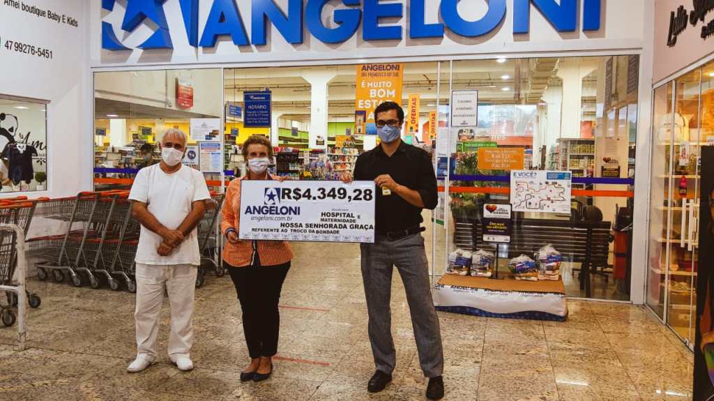 (22/5/2020) – O Hospital e Maternidade N. Srª da Graça, em São Francisco do Sul (SC), (HMMNSG) recebeu nesta quarta-feira, 20, doação de R$ 4.349,28, referente à campanha Troco da Bondade, desenvolvida por um supermercado local. Um cheque simbólico foi entregue à diretora executiva Clemência de Souza, que esteve acompanhada do secretário interino de Saúde do município, Jefferson Pacheco de Moraes.