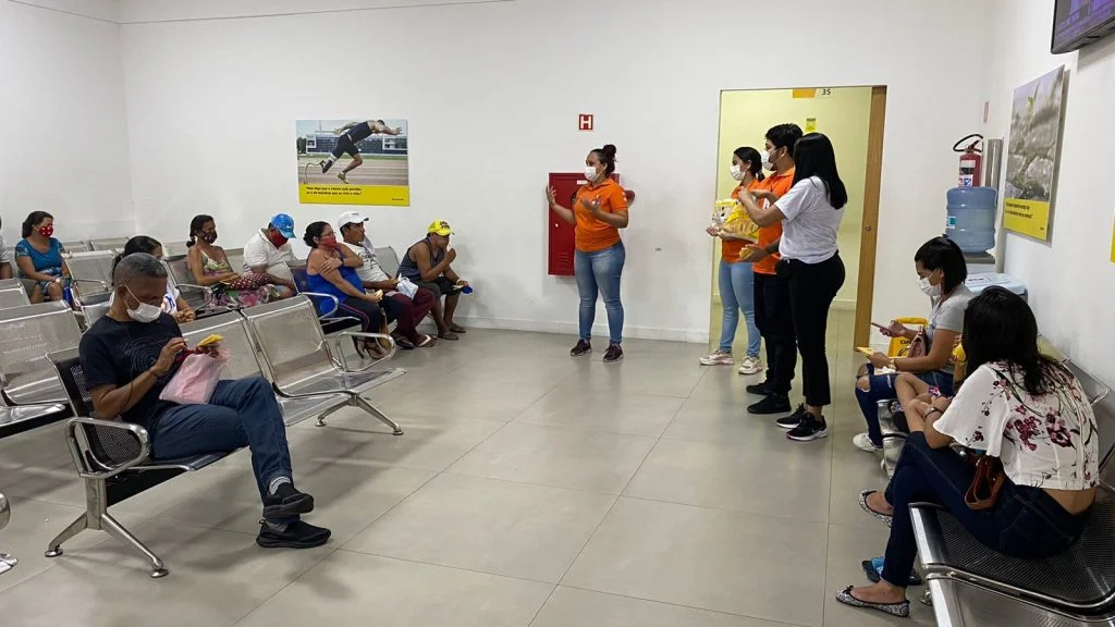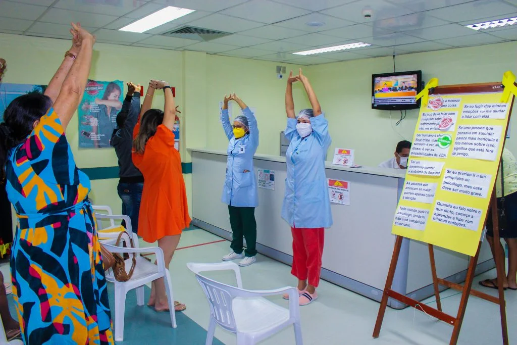 No HRPM, a ação de educação em saúde está voltada à equipe, usuários e acompanhantes, com realização de palestras nas áreas de atendimento, além de dinâmicas de mitos e verdades com assuntos relacionados à saúde mental e brincadeiras, como pular amarelinhas. A atividade foi iniciada pela terapeuta ocupacional Beatriz Garcia, que realizou alongamentos com os participantes, proporcionando um momento de maior descontração entre eles.
