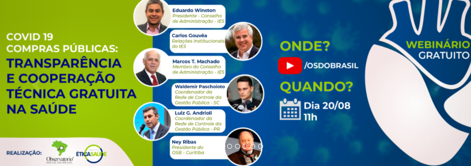 (18/8/2020) – O Instituto Ética Saúde, ao qual o INDSH é filiado desde 2018, promove nesta quinta-feira, 20, a partir das 11h, a live ‘Covid-19 e Compras Públicas: Transparência e Cooperação Técnica Gratuita na Saúde’. A apresentação será na página do youtube Observatório Social do Brasil, parceiro na iniciativa.