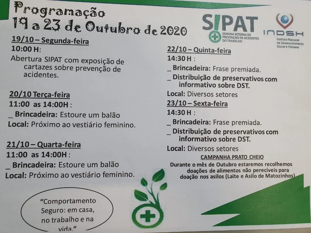 (19/10/2020) – O Hospital e Maternidade Dr. Eugênio Gomes de Carvalho, em Pedro Leopoldo (MG), unidade própria do INDSH, iniciou hoje (19) a Semana Interna de Prevenção de Acidentes do Trabalho (SIPAT), com programação voltada para o público interno. Além disso, está promovendo uma campanha entre os empregados da unidade para arrecadação de alimentos que serão doados a asilos locais.