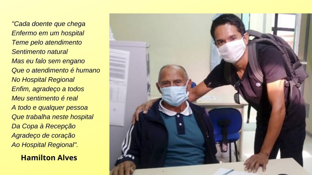 Cada doente que chega/ Enfermo em um hospital/Teme pelo atendimento/sentimento natural/ Mas eu falo sem engano/Que o atendimento é humano/No Hospital Regional. Enfim agradeço a todos/Meu sentimento é real/ A todo e qualquer pessoa/Que trabalha neste hospital/Da Copa à Recepção/ Agradeço de coração/ Ao Hospital Regional”.