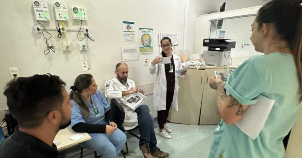A capacitação foi realizada de forma lúdica, por meio de uma dinâmica chamada ‘De Quem É Essa Atividade?’: os participantes receberam imagens representando médicos, enfermeiros, farmacêuticos e assistente social da UPA, para identificar o profissional responsável por cada processo.