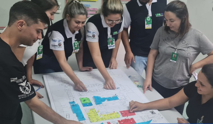 A primeira etapa do treinamento foi realizada com a apresentação do plano e a divisão das funções. Como forma de facilitar o entendimento, uma planta baixa da unidade foi utilizada para mostrar a divisão dos setores e onde cada profissional deverá se dirigir quando o plano for acionado.