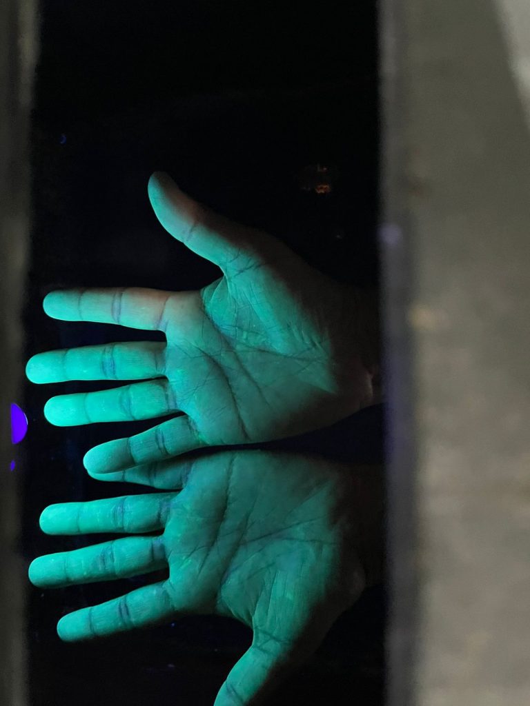 Com auxílio de uma caixa de luz negra e um gel especial, os profissionais realizaram a técnica de higienização das mãos e puderam conferir sua efetividade com a luz negra, que realça os locais onde o gel foi aplicado. O treinamento foi promovido pelo serviço de controle de infecção hospitalar das unidades.